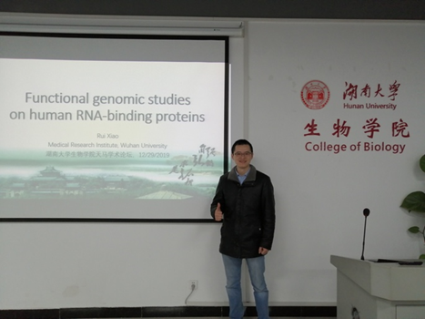 2020年12月29日上午10:30,湖北省“楚天学者”特聘教授、武汉大学医学研究院—肖锐教授,应邀来bwin必赢官网做学术交流,并做了关于Functional Genomic Studies on Human RNA-Binding Proteins的精彩学术报告。该讲座在437bwin必赢国际官网U型楼B111举办,由437bwin必赢国际官网张定校教授主持。学院里众多老师和学生参加了该讲座。